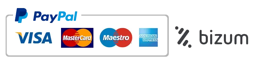 Aceptamos pagos mediante tarjeta de crédito/débito, transferencia bancaria y Bizum.