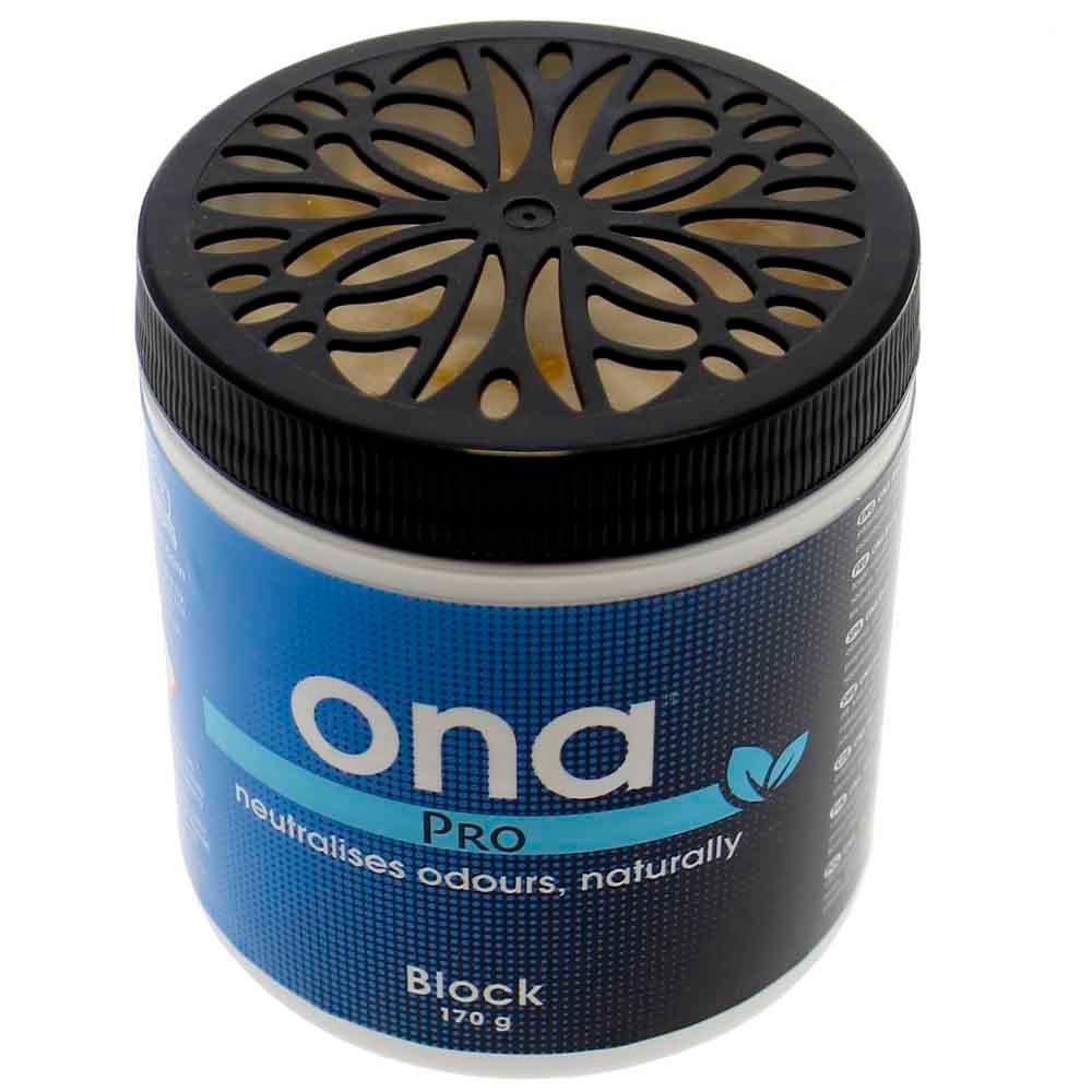 ONA BLOCK, ideal para espacios pequeños como armarios de cultivo de hasta 2 m3 o coches. Se abre la tapa o se hacen pequeños agujeros en ella y situamos el bote allá donde queramos neutralizar los olores.