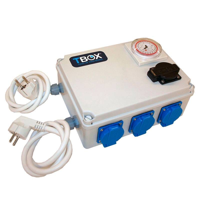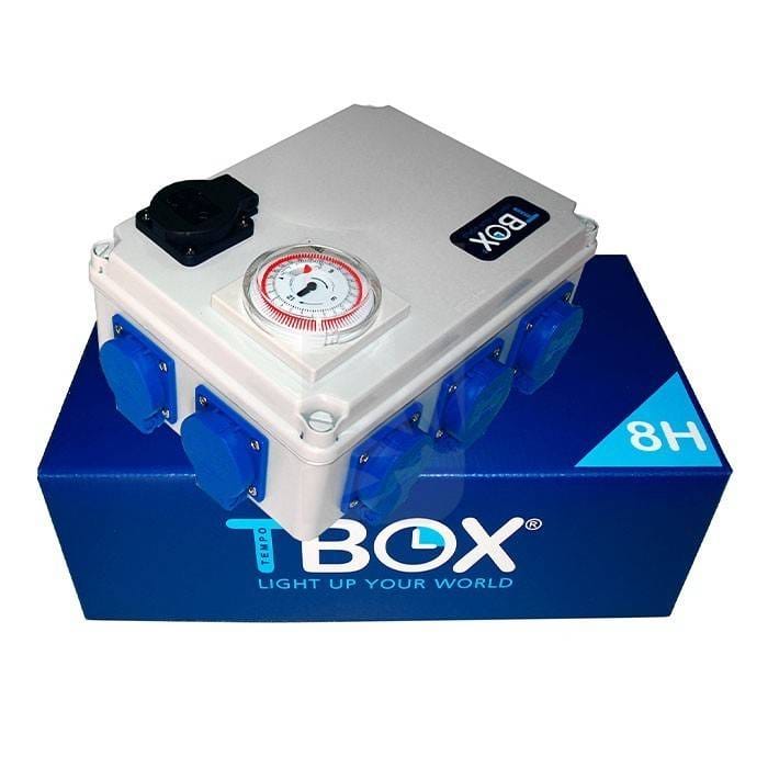TBOX 8: es una caja temporizadora multibase que controla un máximo de 8 accesorios de 630w., 8 de 600w., 12 de 400w., 16 de 315w., ó 4 de 1.000w.